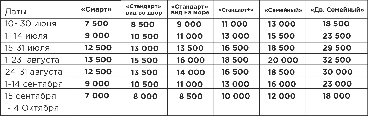 Дополнительное место с предоставлением постельного белья, раскладушки – 1000 рублей за человека в сутки. За питание дополнительного человека оплачивается 1500 рублей.